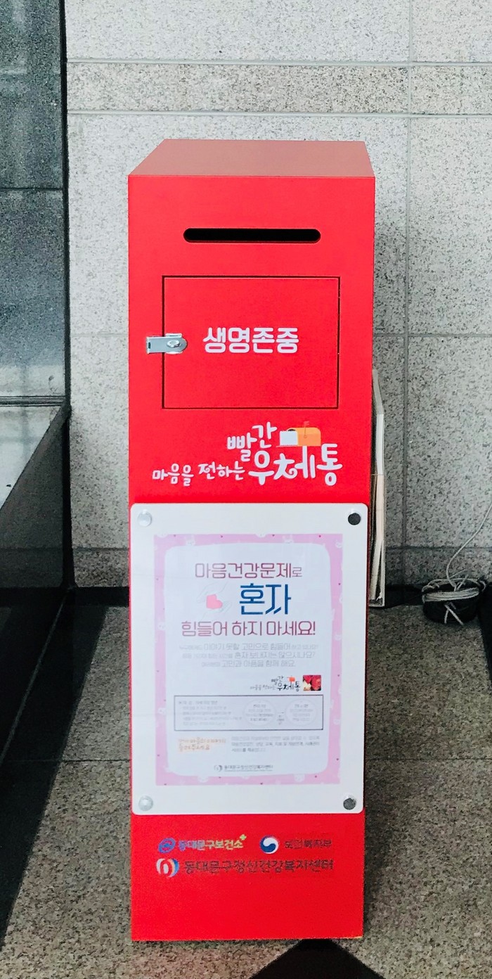 구는 지난달 한국외국어대학교 학생회관과 경희대학교 청운관에 ‘마음을 전하는 빨간우체통’을 설치했다. 빨간우체통 옆에는 자살예방 소책자, 마음상담 편지지 및 엽서 등도 함께 비치해 마음의 상처로 고통 받고 있는 청년들이 상담과 관련한 정보를 얻고 손편지를 통해 고민을 털어놓을 수 있도록 했다.
