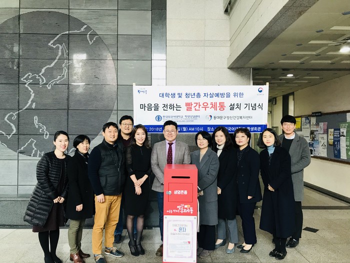 ▲지난달 19일, 한국외국어대학교 학생회관 로비에서 진행된 ‘빨간우체통 설치 기념식’ 모습. |