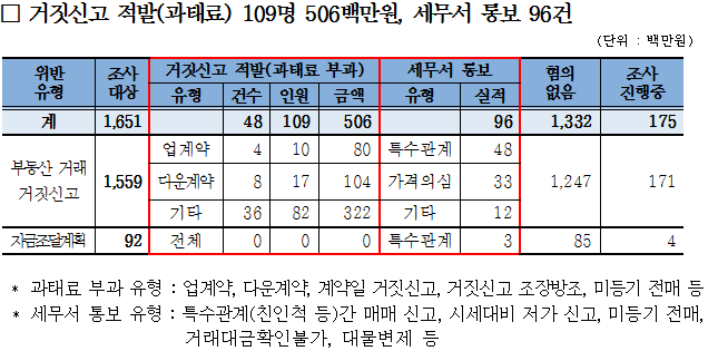 이와 함께 투기과열지구 내 3억 이상의 주택을 거래하면서 자금조달계획서를 거짓으로 신고한 정황이 의심되는 92건에 대한 조사도 병행 실시했다.