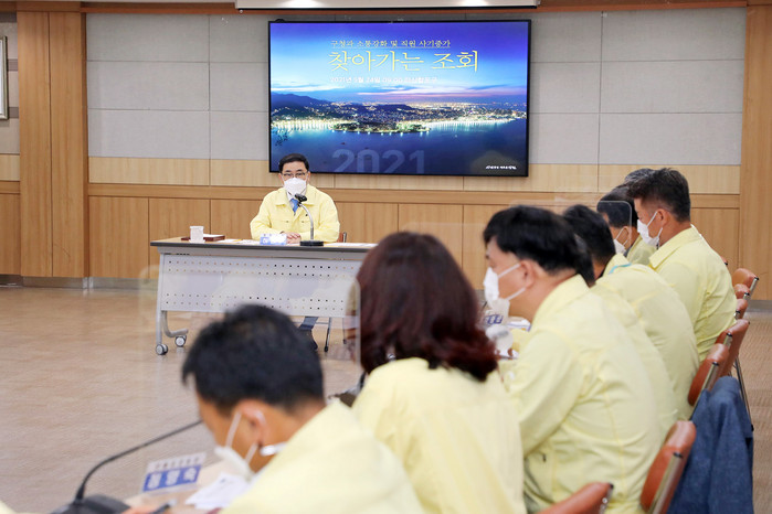 이날 찾아가는 조회는 참석자를 최소화해 마산합포구청 5급 이상 간부 공무원만 참석한 가운데 진행됐다. 허 서장은 민선7기 3년을 맞아 현장과의 끊임없는 소통을 통한 체감행정, 지역민의 요구를 내 일처럼 여기는 적극행정 추진을 당부했다.