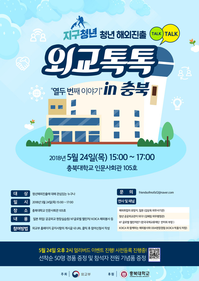 이번 외교톡톡은 ‘지구청년’ 캠페인을 통해 외교부의 해외진출 지원 사업을 소개하는 ‘찾아가는 설명회’의 일환으로 충남대·전북대·한국외대·부산대·경기대에 이어 충북대(청주)에서 개최된다.