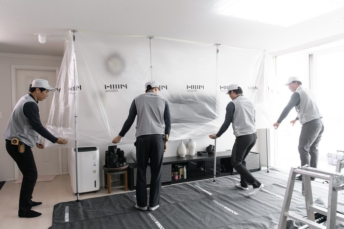 | ▲ 한샘 시공협력 기사들이 고객만족 시공을 위해 시공전 보양작업을 하고 있다. |