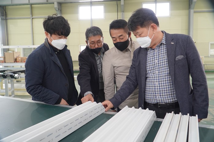 | ▲한샘 안흥국 사장(맨 오른쪽)이 지난 달 협력회사를 방문해 품질강화 방안에 대해 논의하고 있다. [한샘 제공] |