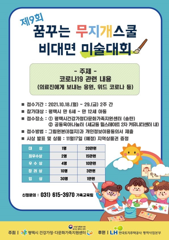 [로컬세계 김병민 기자]경기 평택시건강가정・다문화가족지원센터는 오는 18일부터 29일까지 비대면 ‘꿈꾸는 무지개스쿨 미술대회’를 실시한다고 7일 밝혔다.