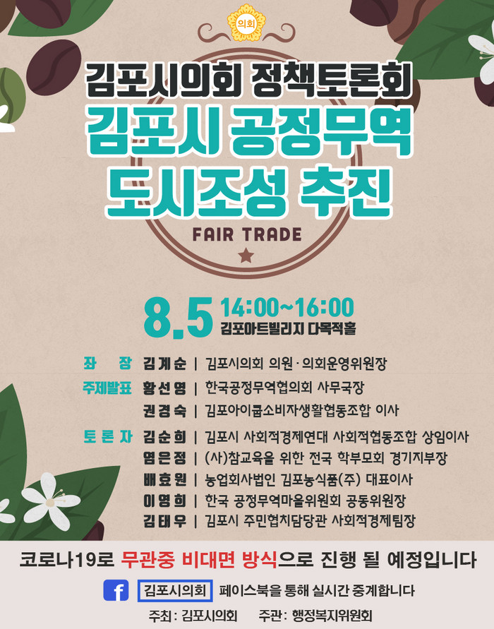 [로컬세계 김병민 기자]경기 김포시의회가 오는 8월 5일 ‘공정무역 도시조성 추진’을 위한 정책토론회를 김포아트빌리지 다목적홀에서 개최한다고 31일 밝혔다.