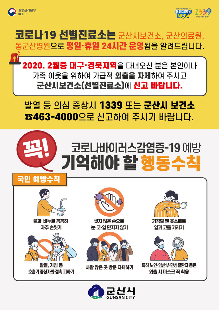 시 관계자는 “전 시민이 코로나19의 확산을 완벽하게 차단하는 철통경비 체계 구축을 위해 예방수칙을 철저히 준수하고 외지 방문이나 행사·집회 등은 취소 또는 연기할 것을 거듭 당부드린다”며 “시에서도 심각 수준에 맞는 자세로 감염증 확산을 위한 빈틈없는 대응책을 마련해 군산시민의 건강과 안전을 지키는 데 최선을 다하겠다”고 말했다.