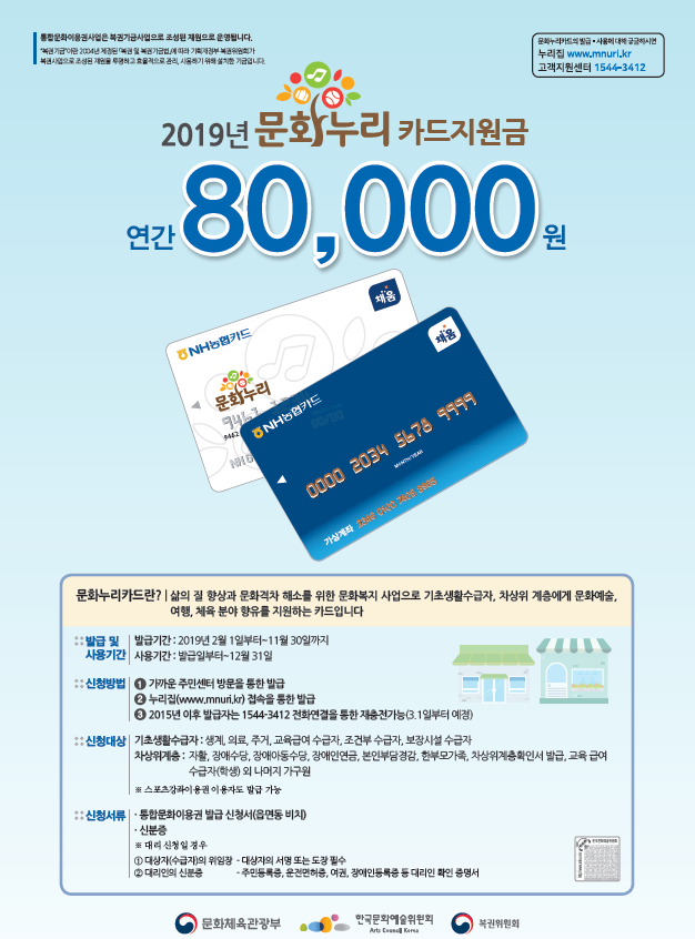 올해는 지원금이 개인당 연 8만원으로 전년보다 1만원 인상됐으며, 기존 카드 발급자의 경우에는 주민센터와 문화누리카드 누리집뿐만 아니라 전화로도 손쉽게 지원금을 재충전할 수 있도록 개선됐다.