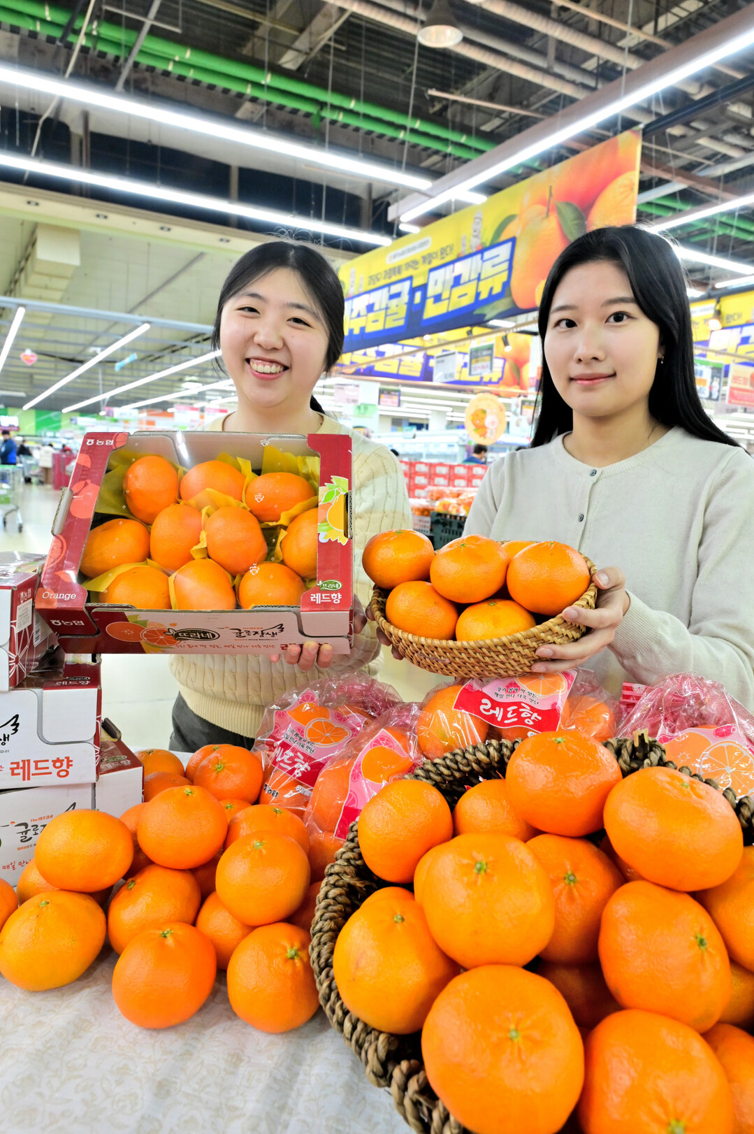 7일 서울 서초구 하나로마트 양재점에서 모델들이 올해 첫 판매하는 '레드향'을 선보이고 있다. 농협유통 제공