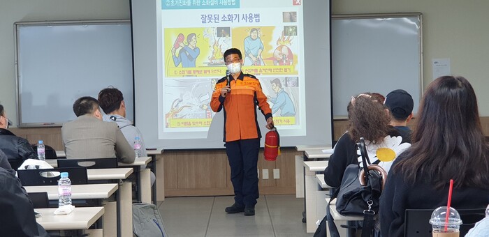 ▲부산진소방서 안전 관계자가 14일 동의대학교 다문화사회통합센터에서 이주 외국인 60명을 대상으로 화재 예방을 위한 교육을 실시하고 있다. 진소방서 제공 |