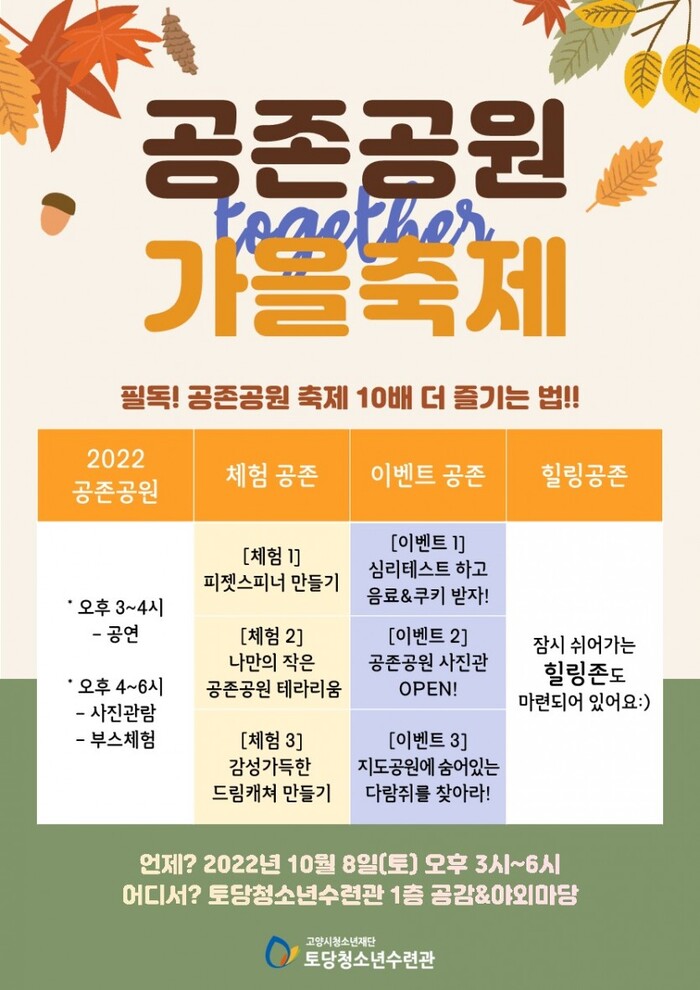 [로컬세계 = 이영원 기자]경기 고양시청소년재단은 오는 8일 토당청소년수련관 야외마당에서 공존공원 축제를 운영한다고 4일 밝혔다.