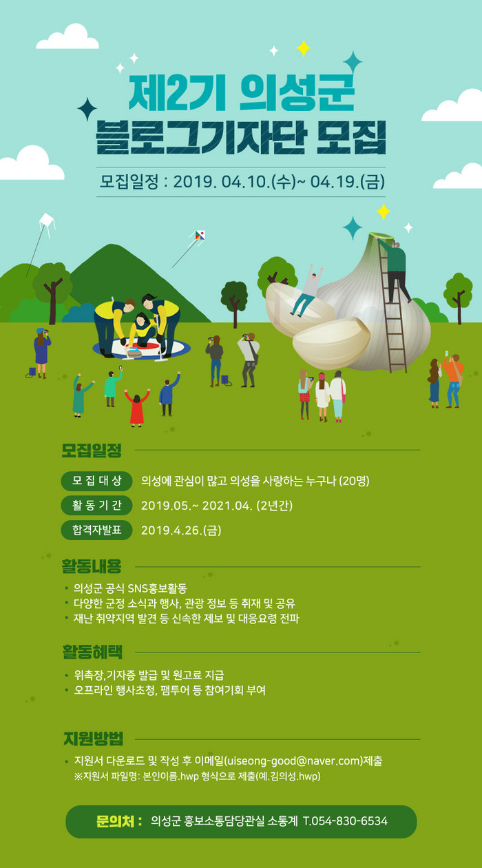 모집인원은 20명으로 개인 블로그 운영자로써 의성에 대한 애착심이 있는 사람이면 누구나 지원 가능하다.