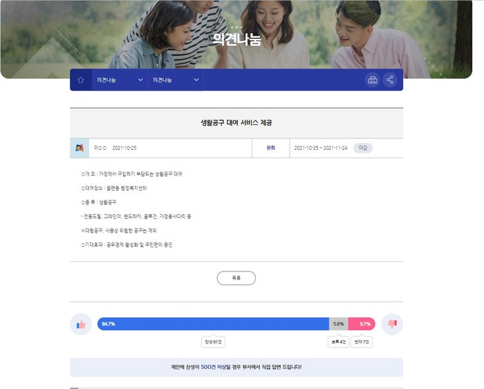 ‘의견나눔’은 시민이 자유롭게 정책을 제안할 수 있는 공간으로, 찬성 500건 이상인 경우 ‘시장의답’에서 시장이 직접 답변을 하며 시민과 직접 소통할 예정이다.
