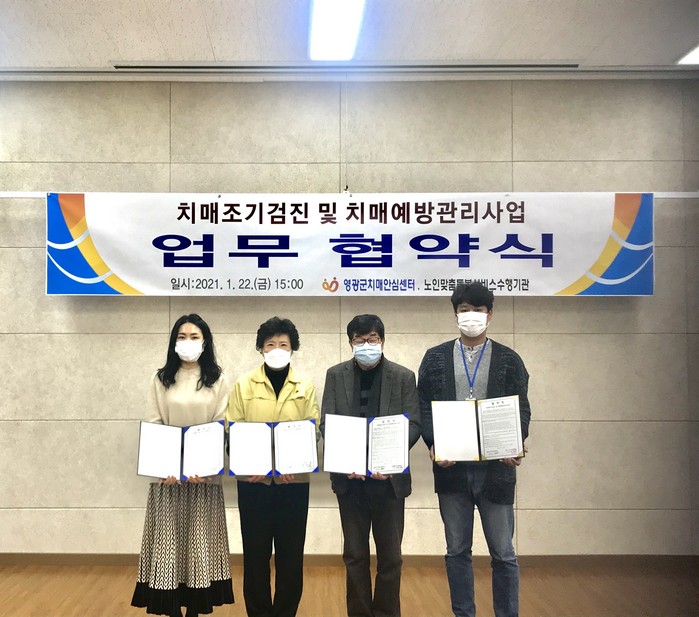 [로컬세계 오승용 기자]전남 영광군(군수 김준성)은 지난 22일 치매안심센터에서 노인맞춤돌봄서비스 수행기관(3개소)과 함께 치매조기검진 및 치매예방관리사업 추진을 위한 업무 협약을 체결했다고 26일 밝혔다.