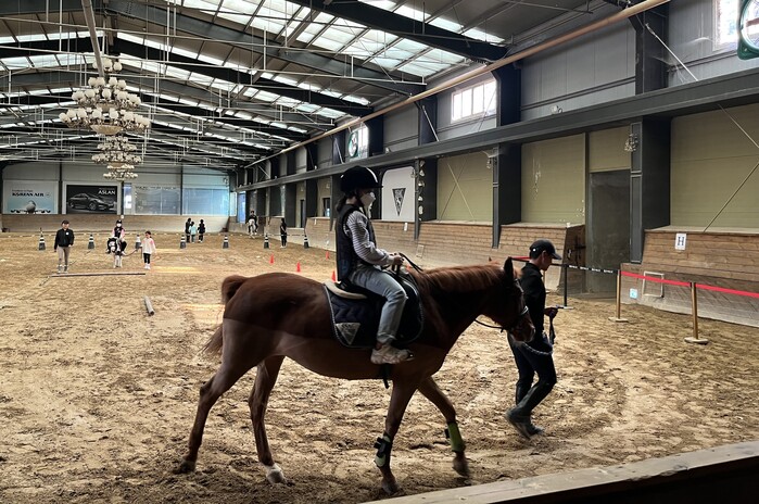▲ 지난해 운영한 _단기 스포츠체험 강좌_ 중 승마체험에서 청소년이 직접 말을 타고 있다.(동작구 제공) |