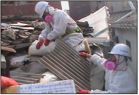 ▲인부들이 슬레이트 지붕을 철거하고 있다. |