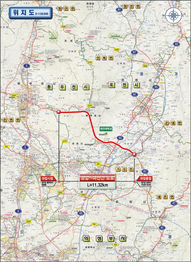 ‘지방도 364호선 광암~마산간 확·포장공사’는 동두천 광암동에서 포천 가산면 마산리를 연결하는 11.32km 2차로 도로를 4차로로 확장하는 사업으로, 총 2천11억 원의 사업비를 투입해 2009년 6월부터 공사를 시작했다.