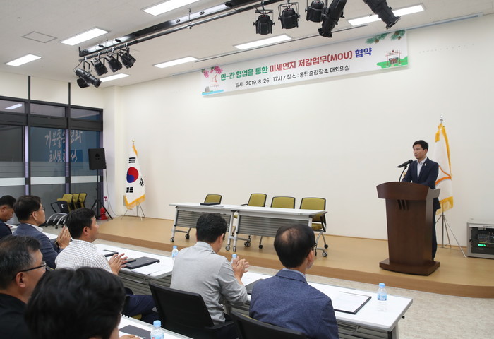 | ▲민·관 협업을 통한 미세먼지 저감 업무협약식에서 서철모 화성시장이 인사말을 하고 있다.(화성시 제공) |