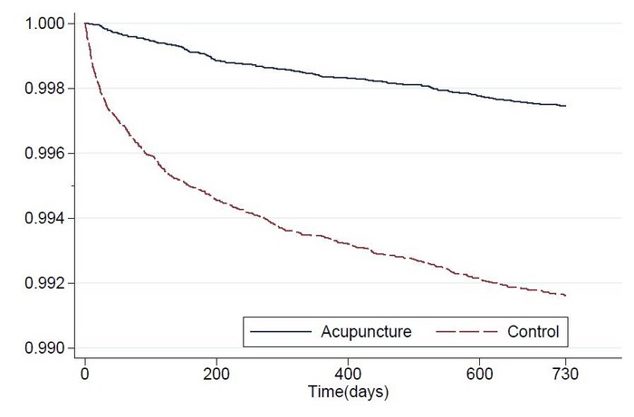 카플란 메이어(Kaplan-Meier) 생존분석에서도 침군이 대조군 보다 어깨수술 시행률에 있어서 높은 누적생존율을 보였다. 해당 연구의 누적생존율은 시간이 지나면서 곡선이 누적생존율 1.0에서 떨어질수록 수술을 받은 인원이 늘어남을 의미한다. 침군의 누적생존율은 시간의 경과에 따라 대조군 보다 완만하게 떨어지는데, 이는 침군의 어깨수술률이 대조군 보다 낮다는 것을 의미한다. 카플란 메이어 생존분석은 사건이 발생한 시점마다 구간생존율을 구해 누적생존율을 추정한다.