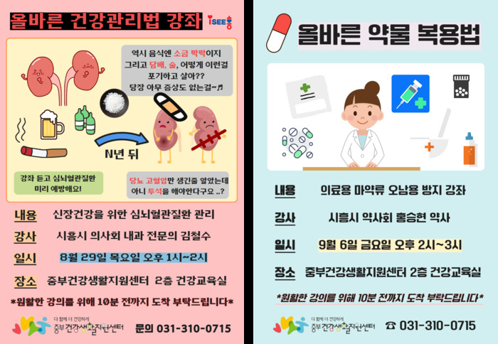 시흥시 의사회와 약사회 추천을 받은 건강전문가가 직접 '신장 건강과 심뇌혈관질환 관리', '의료용 마약류 오남용 방지' 등의 내용을 전달한다. 강좌는 오는 11월까지 매월 진행된다. 자세한 내용은 중부건강생활지원센터 블로그에서 확인할 수 있다.