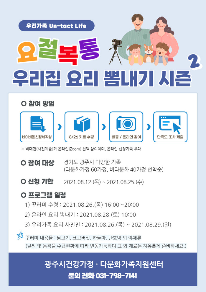 '요절복통 우리집 요리 뽐내기 시즌 2'는 오는 25일까지 광주시에 거주하는 다양한 가족 100가정을 선착순으로 모집하며, 광주시 건강가정·다문화가족지원센터 홈페이지, 카카오스토리, 페이스북에 게시돼 있는 네이버 폼을 통해 신청할 수 있다.