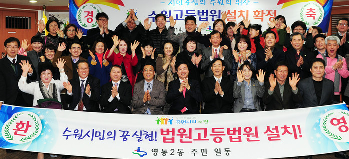 | ▲2014년 2월 수원고등법원 설치가 확정된 후 기뻐하는 염태영 수원시장(앞줄 가운데)와 시민들. |