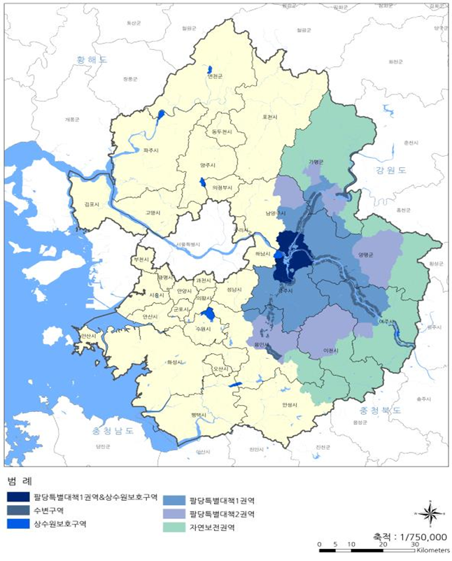 규제지도에 따르면 가장 심한 규제를 받고 있는 곳은 광주, 양평, 가평, 여주, 이천, 남양주, 용인 등 경기동부 7개 시군이다. 1990년 팔당특별대책지역으로 지정된 이들 7개 시군의 면적은 2097㎢로 도 전체면적의 21%를 차지한다. 서울시 전체 면적보다도 약 3.5배나 큰 규모다. 이 지역에서는 일정규모 이상의 공장, 양식장, 숙박업, 음식점, 축사, 폐수배출시설 설치가 불가능하다.