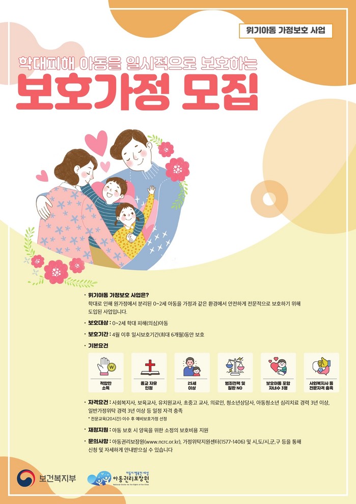 위기아동 가정보호 사업은 학대피해로 인해 원가정에서 분리조치된 만0~2세 아동을 가정과 같은 환경에서 안전하고 전문적으로 보호하기 위해 도입된 사업으로, 학대피해아동을 전문위탁 가정의 자격요건을 갖춘 보호가정에서 일시적(최대 6개월)으로 보호한다.
