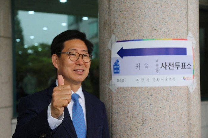 양승조 후보는 이날 논산시 삼성전자 사거리에서 아침 유세를 마치고 취암동 사전투표소인 논산문화예술회관에서 논산시 출마자들과 함께 한 표를 행사했다.