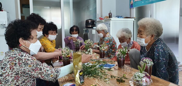 지난 4일 대사1리, 옥정2리 경로당 어르신들은 함부로 버리지도 못하고 집에 굴러다니는 아이스팩에 계피가루, 들꽃을 이용하여 천연모기 기피제 만드는 수업을 진행해 큰 호응을 얻었다.