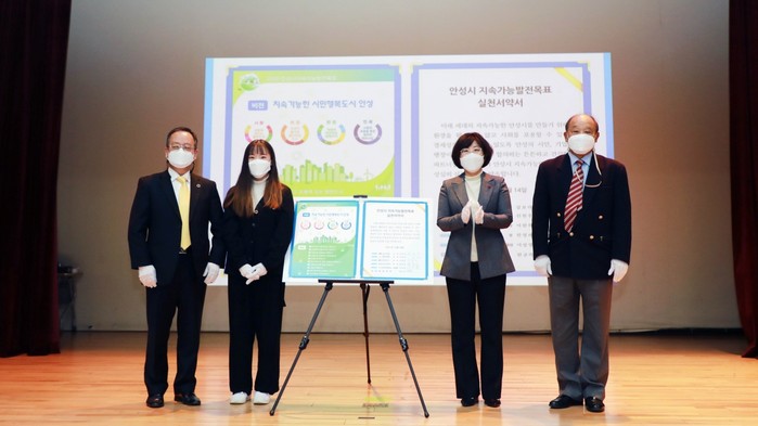 이날 선포식에는 행정대표로 김보라 안성시장이, 의회대표로 신원주 안성시의회 의장이, 학계대표로 이원희 한경대학교 총장이, 기업대표로 한영세 안성상공회의소 회장이, 시민대표로 이상영 안성시 지속협 상임회장이 참여해 미래세대 대표와 함께 지속가능발전목표를 함께 이행하기 위한 실천서약서를 작성했다.