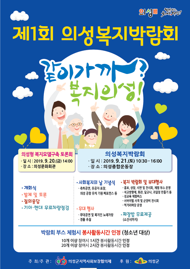 ‘같이가까? 복지의성!’이라는 슬로건 아래 열리는 이번 복지박람회는 기존 행사와 다르게 20일‘의성형복지모델 구축을 위한 토론회’를 시작으로 21일 사회복지의 날 기념식과 60여개의 홍보.체험부스, 무대공연 등 다양한 행사를 마련할 계획이다.