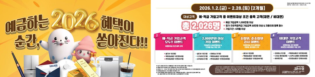 수협은 오는 2월 28일까지 예·적금 신규 가입고객을 대상으로 ‘2026 예금하는 순간, 혜택이 쏟아진다’ 이벤트를 진행한다.