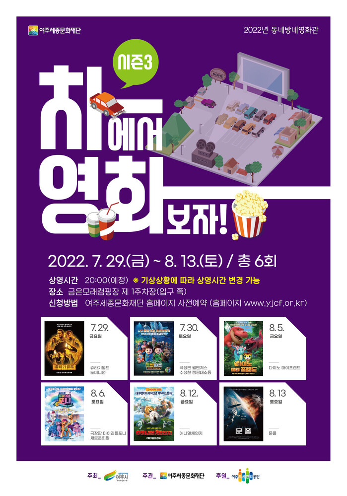 [로컬세계=김병민 기자]경기 여주세종문화재단은 오는 29일부터 다음달 13일까지 금은모래캠핑장 1주차장에서 ‘동네방네영화관 – 차에서 영화보자 시즌3’를 진행한다.