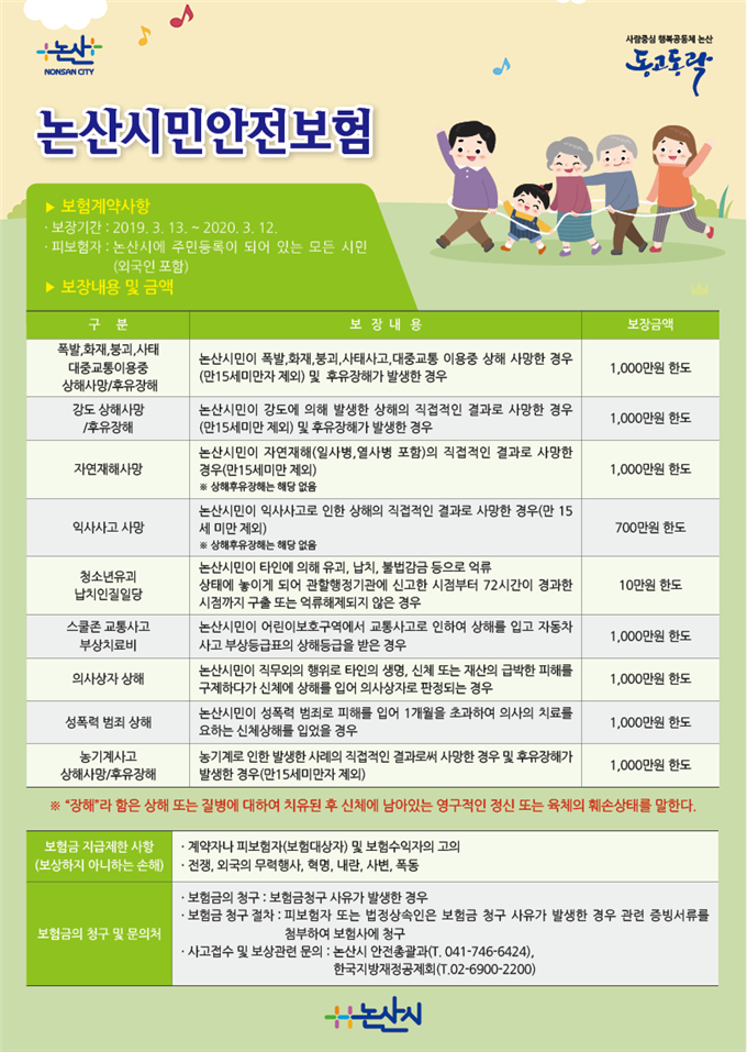 가입대상은 논산시에 주민등록을 두고 거주하는 모든 시민(외국인 포함)으로, 별도의 가입 절차나 조건 없이 자동으로 보험수익자가 되며, 보장기간은 내년 3월 12일까지다.