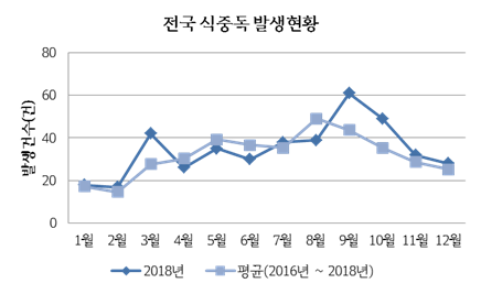 3월에 연중 식중독 발생이 가장 많은 9월(61건. 증상자 4,763명)과 10월(49건.증상자 617명)에 이어 3번째로 높은 발생건수를 기록했다.