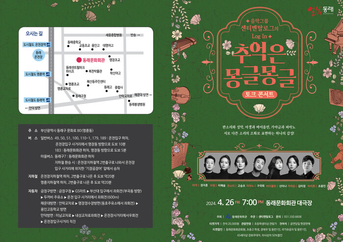 [로컬세계 부산=김의준 기자]부산 동래구는 센티멘탈 로그 IN의‘추억은 몽글몽글’공연을 오는 4월 26일 금요일 오후 7시 동래문화회관 대극장에서 개최한다고 29일 밝혔다.