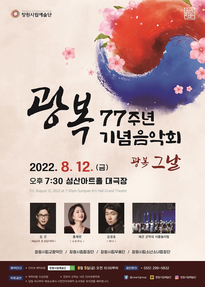 [로컬세계=한용대 기자]경남 창원특례시(시장 홍남표)는 광복77주년을 맞아 특별기획공연으로 ‘창원시립예술단 “광복절 기념음악회”를 오는 12일오후 7시30분 성산아트홀 대극장에서 개최한다’고 밝혔다.