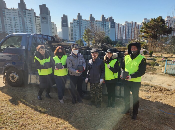 | ▲ 풍무동생활안전협의회 회원들이 지역 소외계층 어르신 가정에 연탄 400장을 전달했다. 김포시 제공 |