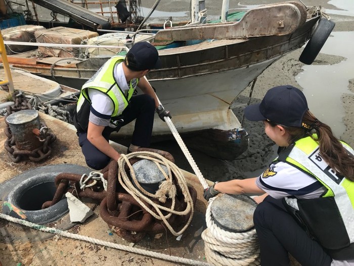 ▲군산해경이 항포구 점검 중 어선 계류색 보강 조치를 하고 있다.(군산해양경찰서 제공) |