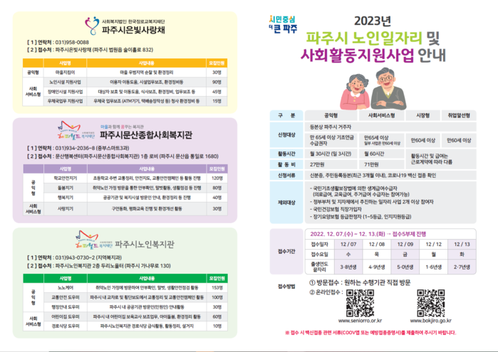 참여 희망자는 신분증, 주민등록등본, 코로나19 백신 접종 증명서 등 관련 서류를 지참해 주소지 읍면동 주민센터, 파주시니어클럽, 대한노인회파주시지회, 파주시노인복지관, 파주시문산종합사회복지관, 파주시은빛사랑채 등 각 사업 수행기관을 방문해 신청하면 된다.