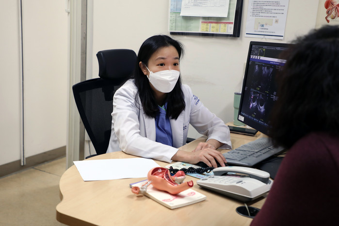 ▲강동경희대학교병원 산부인과 편승연 교수가 한 환자와 진료상담하고 있다. <사진제공=강동경희대병원> |