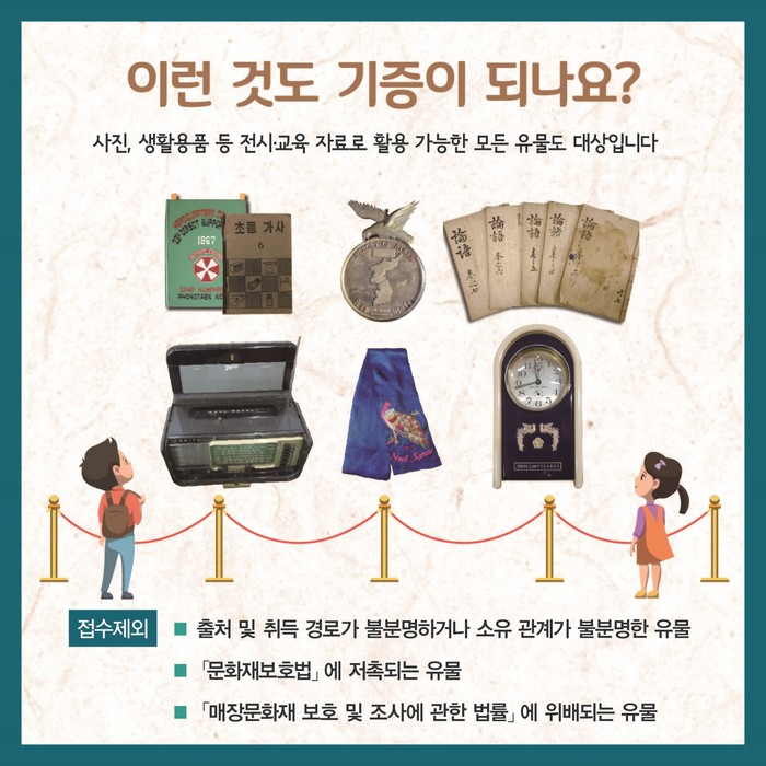 단, 출처 및 취득 경로가 불분명하거나 소유 관계가 불분명한 유물, 「문화재보호법」에 저촉되거나 '매장문화재 보호 및 조사에 관한 법률'에 위배되는 유물, 파손의 정도가 심해 문화재적 가치가 없는 유물 등은 기증・기탁 대상에서 제외된다.