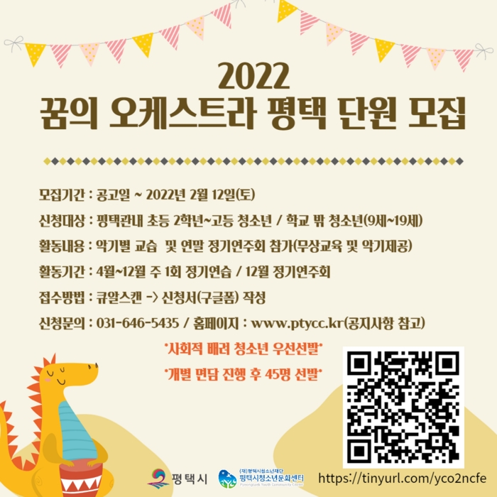 [로컬세계 김병민 기자]경기 평택시청소년문화센터에서는 ‘2022 꿈의 오케스트라 평택’ 신규 단원을 모집한다.
