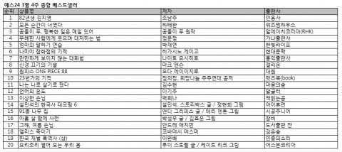 ▲예스24 3월 4주 종합 베스트셀러 순위.(YES24 제공) |
