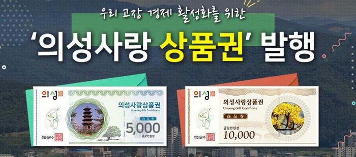 의성사랑 상품권은 지역상권 활성화를 위해 의성군에서 발행한 지역화폐다. 이번 추석명절 이벤트를 통해 월 50만원, 연간 400만원의 범위에서 10% 할인(상시 6%)된 가격으로 구매할 수 있으며 생활과 밀접한 관련이 있는 각종 소매점, 마트, 전통시장, 음식점, 주유소, 병.의원, 서비스업 등 1,340여개의 가맹점에서 현금처럼 사용할 수 있다.