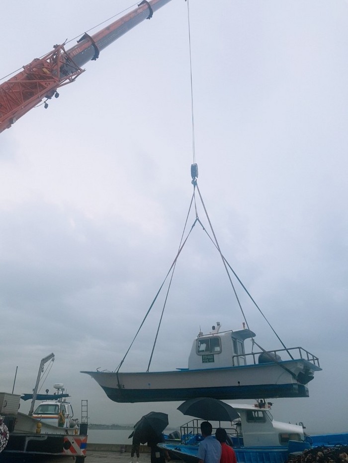 | ▲5일 궁평항에 정박중인 어선을 크레인으로 인양하는 모습. |