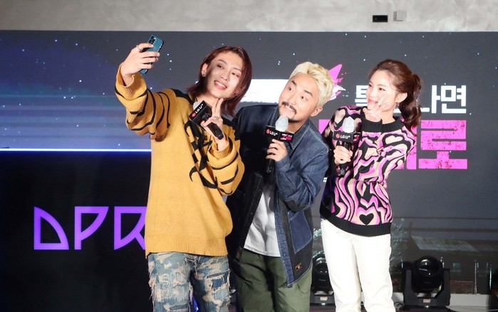 ▲29일 서울 강남 복합문화공간 '일상비일상의틈'에서 iPhone 12 Pro와 iPhone 12의 론칭행사 '틈 만나면 Z맘대로' 장면. (왼쪽부터)래퍼 DPR Live, 방송인 유병재, LG유플러스 신입사원 문혜리씨가 iPhone 12 Pro로 셀카를 찍고 있다. |