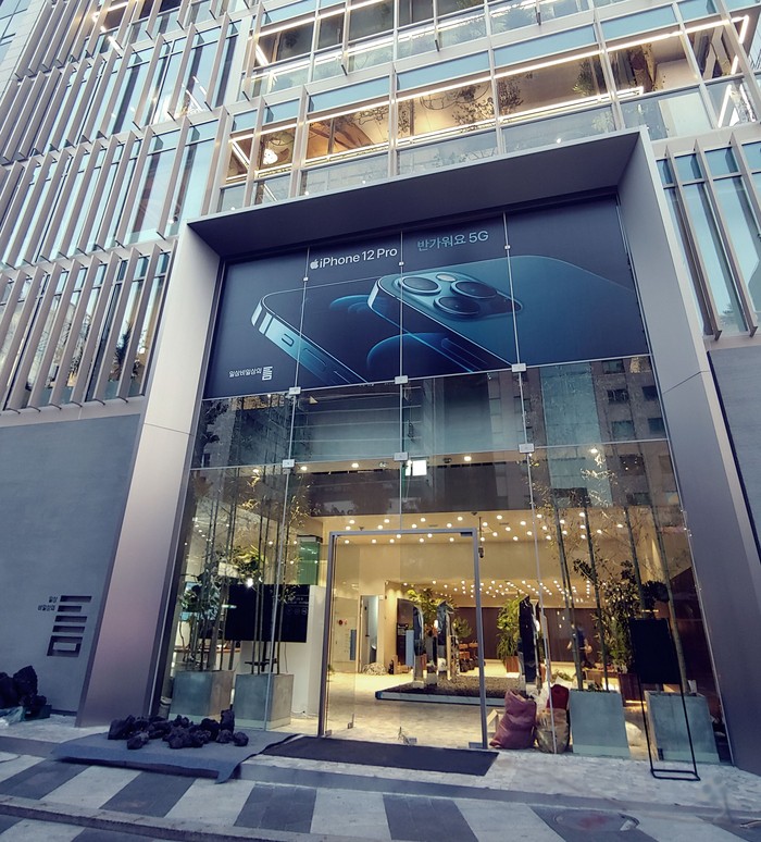 ▲30일 강남역 복합문화공간 ‘일상비일상의틈’ 파사드에 iPhone 12 Pro가 그려진 모습. |