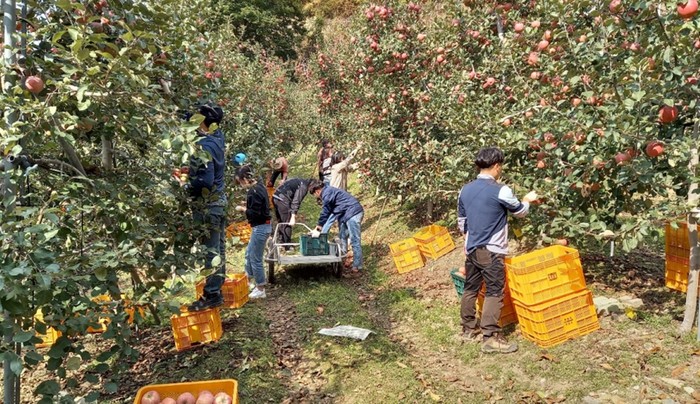 이번 일손 돕기는 농촌의 고령화와 코로나19 여파로 인력수급에 어려움을 겪고 있는 농업인의 적기영농지원을 위해 마련됐으며, 지역재생과 직원 25명을 투입해 사과 수확작업과 농장 환경정리 활동을 벌였다.