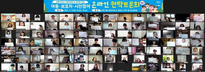 아울러 광주시의 아동친화 수준을 파악하고 아동요구를 반영한 전략사업 마련을 위해 아동과 아동관계자 등 1천692명을 대상으로 광주시의 아동친화수준에 대해 설문조사를 실시하고 93명의 시민이 온라인으로 한자리에 모여 원탁토론회를 통해 목소리를 직접 듣는 시간도 가졌다.